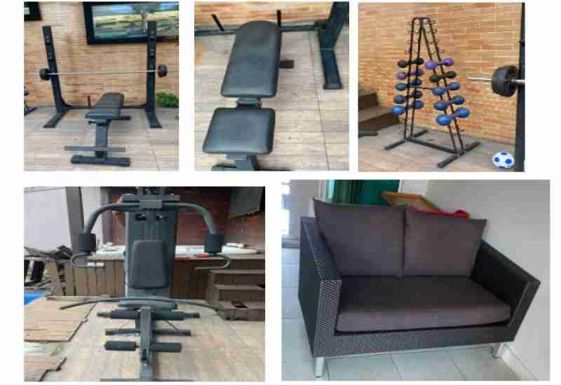 - 01 Suporte + Barra para SUPINO, com banco reto desgastado, duas anilhas de 3kg e duas de 5 kg, avaliadas em R$ 600,00 (seiscentos reais);