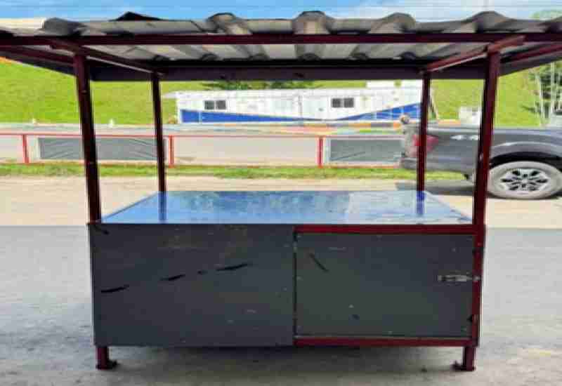 DADOS DO BEM: 01 (uma) Barraca em ferro e alumínio, nas cores azul e vermelho com cobertura em ferro e alumínio, balcão integrado com espaço interno para acondicionamento de materiais e condimentos/alimentos, estando a barraca em bom estado de conservação.